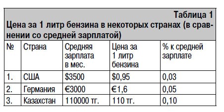 По данным МЭБП, “помимо высоких налогов на автомобили в развитых странах Европы владельцы транспорта несут значительные расходы на покупку бензина, цена которого минимум в 2 раза выше, чем в Казахстане”. Эдуард не поленился - посчитал цену литра бензина относительно средней зарплаты и получил совершенно противоположные результаты (см. таблицу 1).