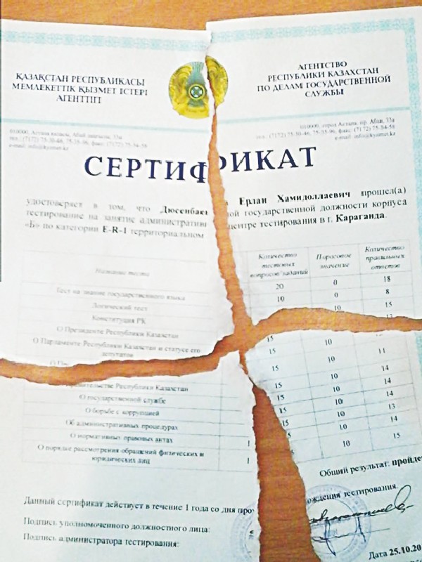 - С каждым годом государственный механизм все чаще дает сбои. Сейчас во всех госорганах идет, можно сказать, война. Поэтому я решил, что дальше на такой госслужбе мне делать нечего. У меня сложилось впечатление, что любую должность можно занять, если у тебя есть или агашка, или большие деньги. Вот мое отношение к государственной службе! - с этими словами Ерлан Дюсенбаев порвал свой сертификат.