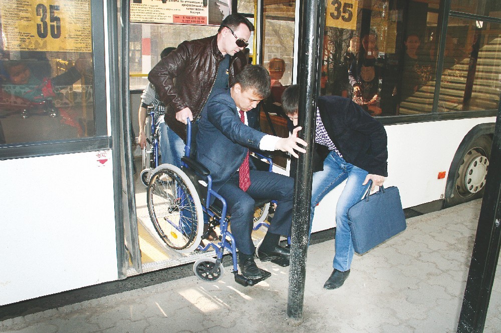 Метров шестьсот по тротуару, переход дороги по светофору, заезд в Казахский драматический театр, затем одна остановка на автобусе до аптеки и последняя точка - ЦОН. Маршрут, который решили преодолеть чиновники, любому настоящему инвалиду, наверное, показался бы несложным. Однако экспериментаторы на первых же минутах столкнулись с непреодолимым для них препятствием в виде длинной щели в асфальте. Самостоятельно через нее перебраться никто не смог, всем помогали журналисты, которые сопровождали передвижения чиновников по городу.