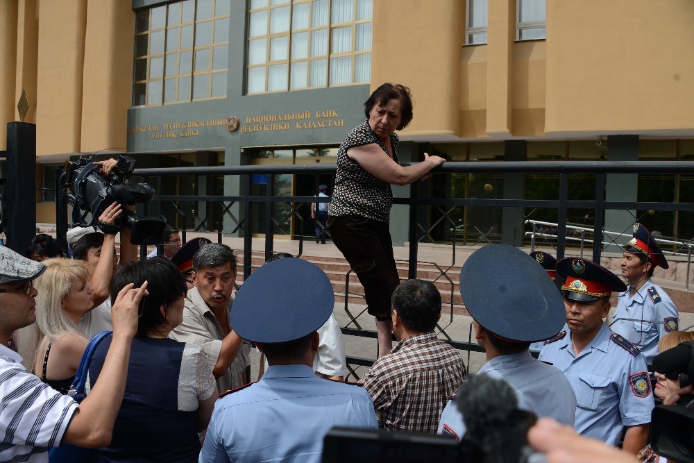 Свои претензии пикетчики хотели высказать лично председателю Нацбанка Кайрату Келимбетову, однако “гостеприимные” хозяева не пустили их даже на порог. Упершись в закрытые ворота, люди начали трясти ограду и кричать: “Келимбетов, выходи!”. Одна из участниц акции протеста - оставшаяся без крыши над головой пенсионерка Татьяна АЛЕНКИНА - даже взобралась на забор, и снять ее оттуда не могли даже полицейские.