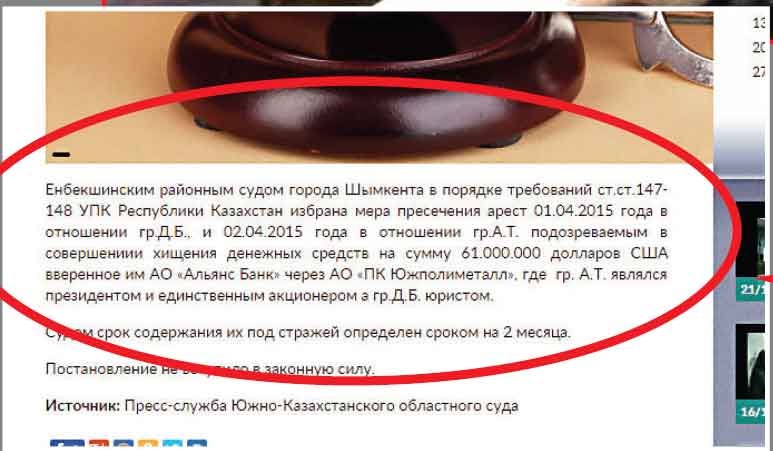 Когда верстался номер, наш корреспондент зашла на официальный сайт Южно-Казахстанского областного суда и обнаружила, что размещенная там информация об аресте президента АО “ПК Южполиметалл” бесследно исчезла.