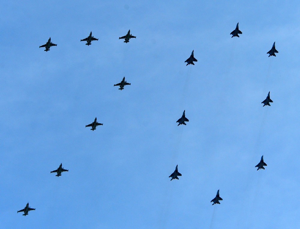 Зрители еще не успели насладиться парадом машин, как услышали гул самолетов. Над Астаной промчались новейшие самолеты и вертолеты, в том числе сверхманевренные истребители Су-30 СМ, которые совсем недавно пополнили казахстанские ВВС.