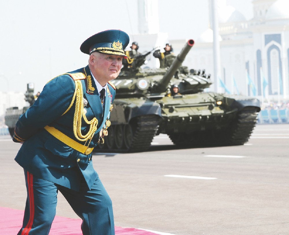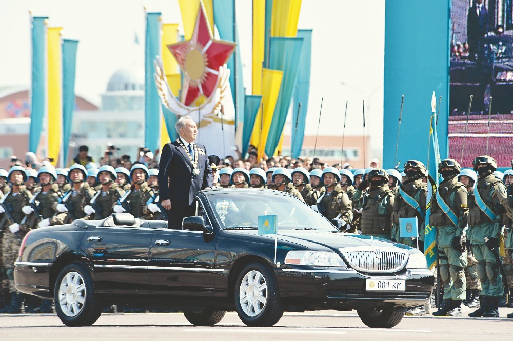 Вот Верховный главнокомандующий Вооруженными силами Нурсултан НАЗАРБАЕВ принимает доклад министра обороны Имангали ТАСМАГАМБЕТОВА и, стоя в парадном кабриолете, под громогласное “Ура!” объезжает стройные ряды участников парада.