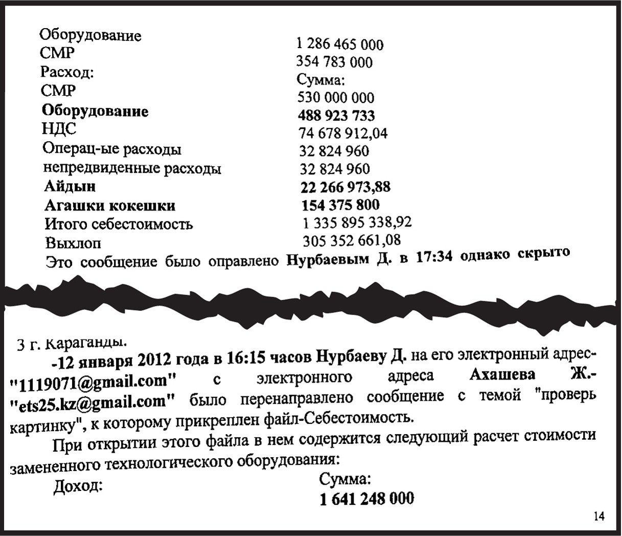 12 января 2012 года в 16 часов 15 минут Нурбаеву пришло письмо с электронного адреса некого АХАШЕВА Ж. с темой “проверь картинку”. К нему был прикреплен файл с названием “Себестоимость”. В нем содержался расчет стоимости замененного технологического оборудования: