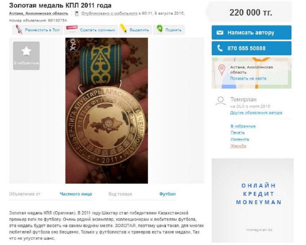 На одном из казахстанских сайтов бесплатных объявлений появилось сообщение о продаже чемпионской награды, которую в 2011 году вручали футболистам карагандинского “Шахтера”. Автор объявления по имени Тамерлан надеялся выручить за нее 220 тысяч тенге.