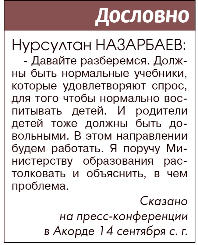 Про новые пособия по русскому языку для 5-х и 7-х классов в этом году узнали даже те, чьи дети давным-давно окончили школу. Шумели родители так, что глас возмущенных услышал Нурсултан НАЗАРБАЕВ. На пресс-конференции в Акорде в минувший четверг президент фактически поручил Министерству образования и науки разрядить ситуацию в школьно-родительской среде.