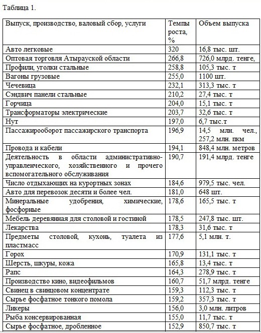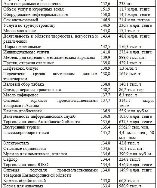 Из таблицы видно, что прорывные производства отмечены практически во всех сферах. Рекордные объемы жилищного строительства адекватно увеличили спрос на строительные материалы: уголок, прутки, арматуру, профили, сэндвич-панели, для обустройства нового жилья закуплено рекордное количество отечественной мебели. Большие усилия предприняты по развитию транспортного- и энергомашиностроения. Производство грузовых вагонов вышло на рекордный уровень, выпуск на Кентауском трансформаторном заводе инновационных изделий позволил нарастить их долю как на внутреннем, так и на внешних рынках. Быстро растет внутренний туризм, набирают обороты курортные зоны.