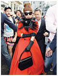 Леди Гага предстала перед папарацци в ярко-красном платье, стилизованном под шинель времен царской России. Звезда дополнила образ массивным украшением из перьев на шею.