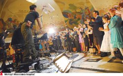 Тем временем на съемочной площадке царило броуновское движение: осветители, декораторы, помощники сломя голову носились туда-сюда. В заключительный съемочный день снимали две свадьбы - веселый праздник с танцами и кучей гостей. В центре зала собралась массовка, в рядах которой было замечено немало актеров театра им. Лермонтова. Они делают два шага назад, звучит команда