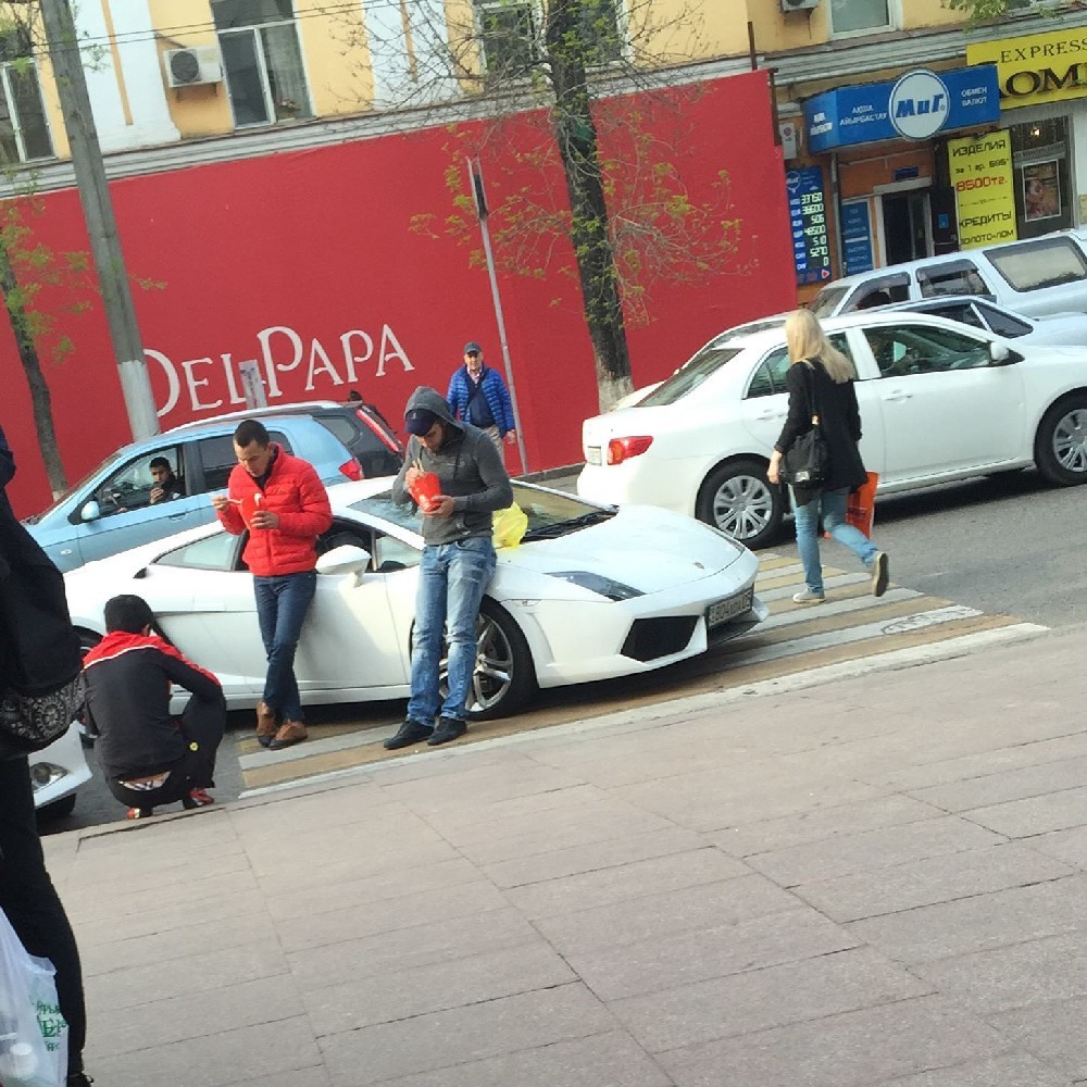 Пикник у обочины: автомобиль Lamborghini припаркован на пешеходном переходе через улицу Гоголя в районе супермаркета “Юбилейный” в Алматы.
