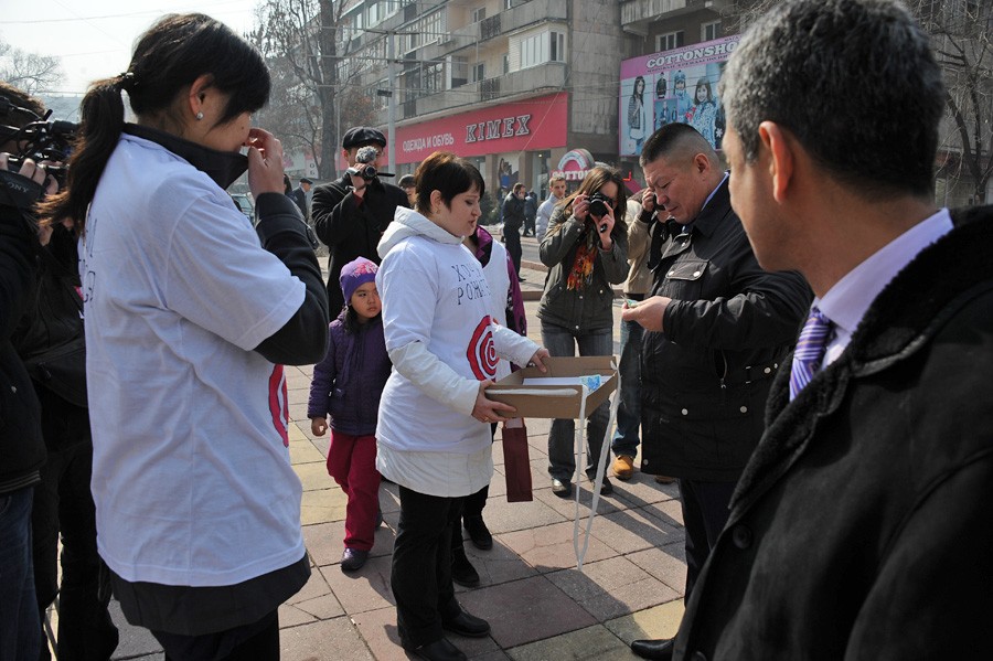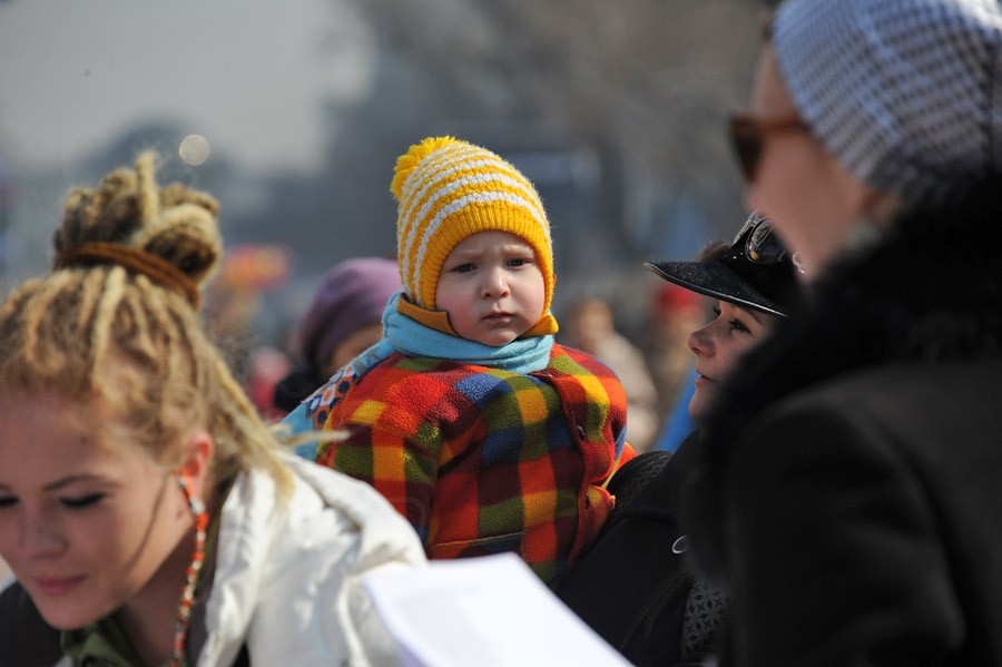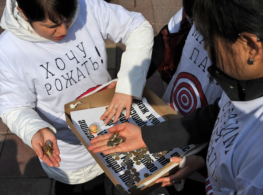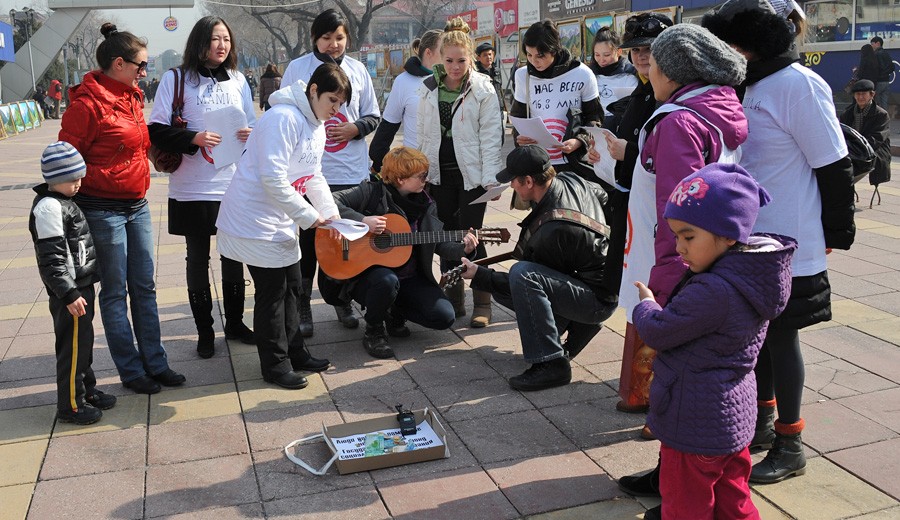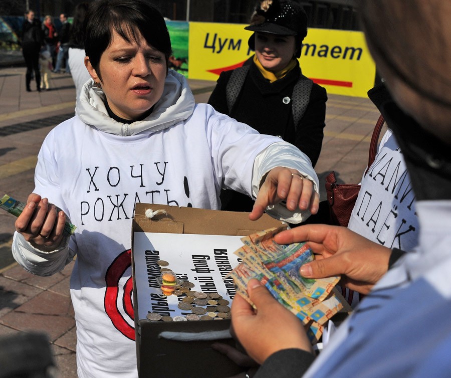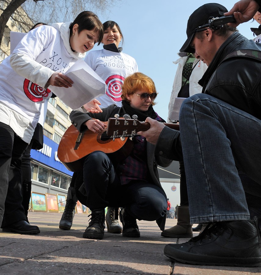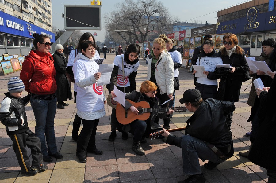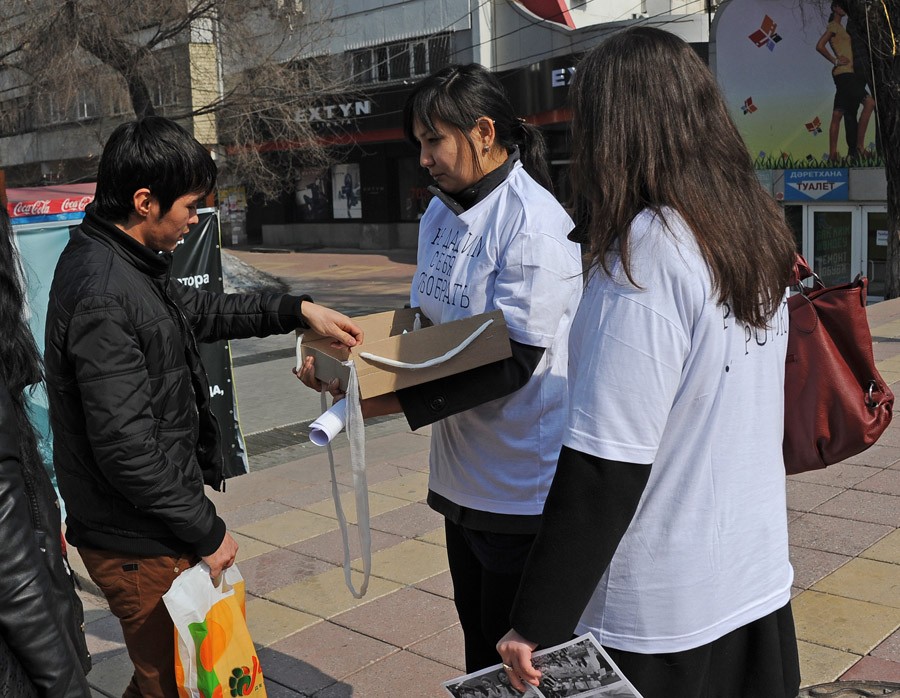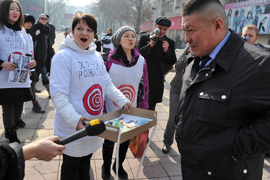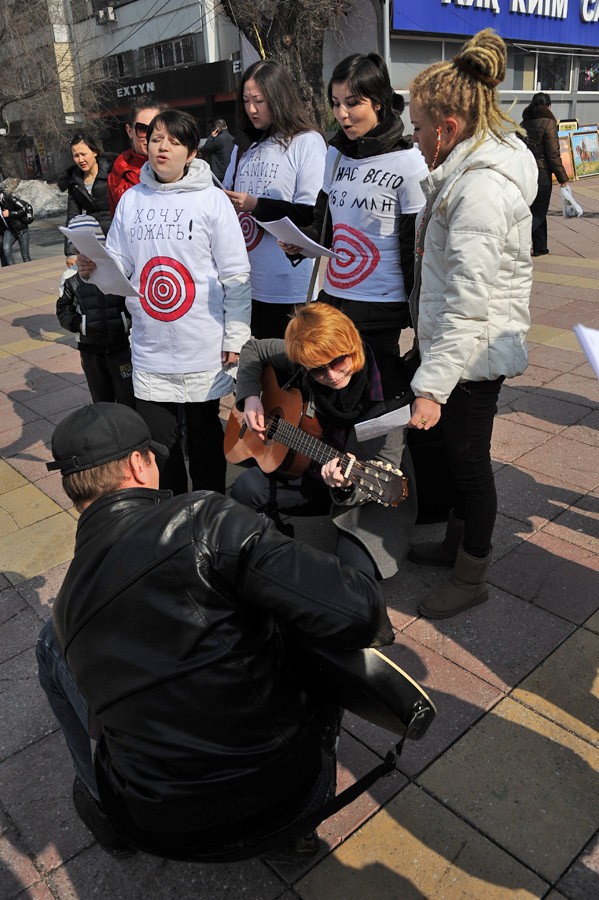 Сегодня, 2 марта, на Алматинском Арбате состоялся очередной флешмоб инициативной группы, выступающей против сокращения пособий по беременности и родам для тех женщин, чей доход превышает 10 минимальных заработных плат.