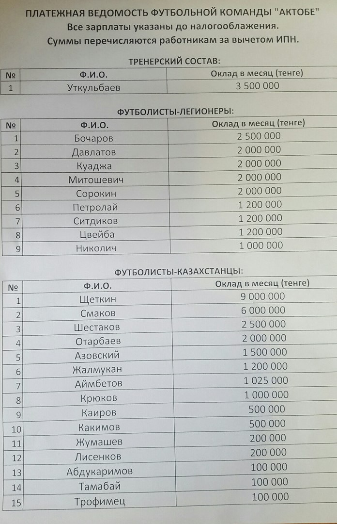 Легионерам в «Актобе» платили скромнее - от 1 миллиона до 2,5 миллионов тенге.