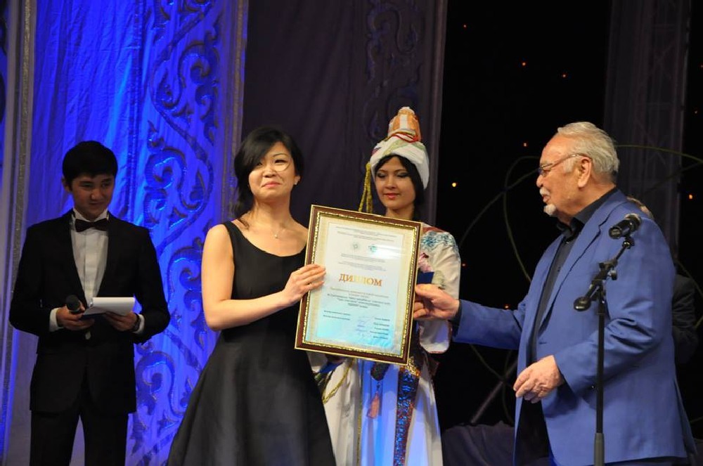 Председатель жюри Асанали АШИМОВ вручает артистке театра Наталье ЛИ (слева) диплом.