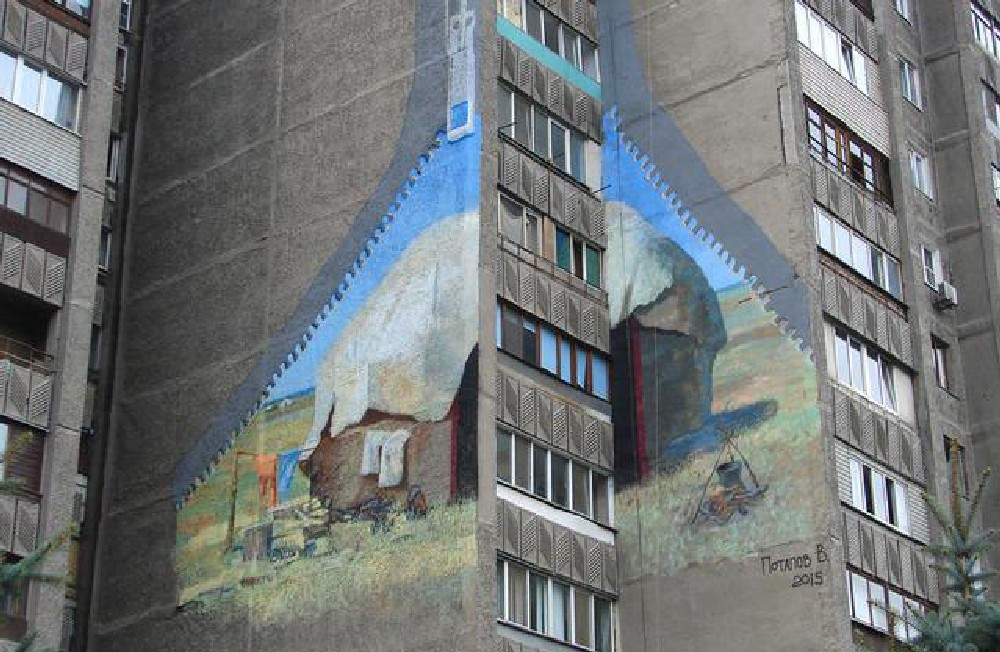 Кэрри НЬЮМАЙЕР из США вместе с казахстанскими школьниками нарисовала панно по мотивам сказки “Ер Тостик”, которое разместили на стене школы им. А. Кастеева. Национальную тему продолжил известный российский художник Владимир ПОТАПОВ, который изобразил на торцах двух 14-этажных домов в микрорайоне “Аксай” 3D-юрту. Если смотреть прямо на стену, это цельная картина, но стоит сделать два шага в сторону, как нарисованная молния расходится, открывая ряд балконов и окон.