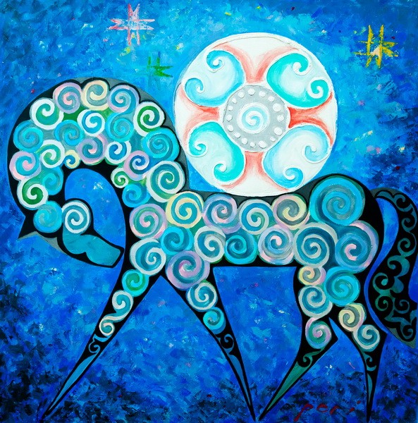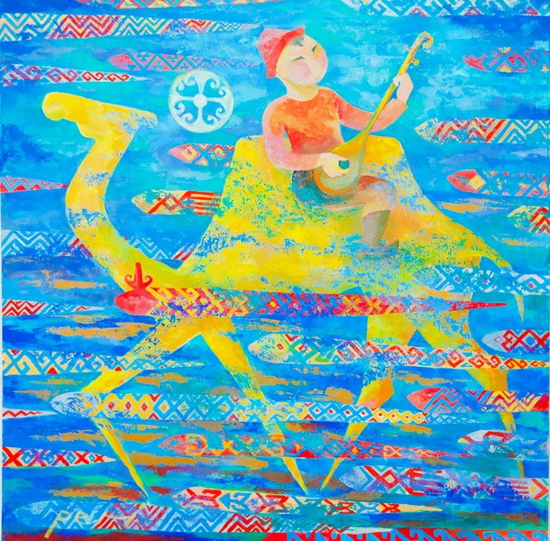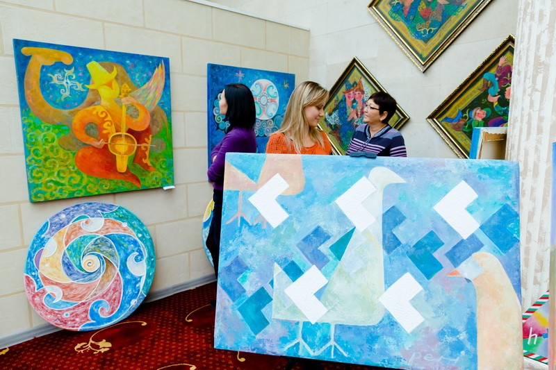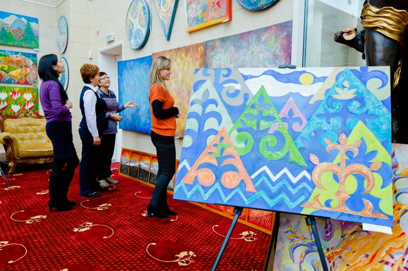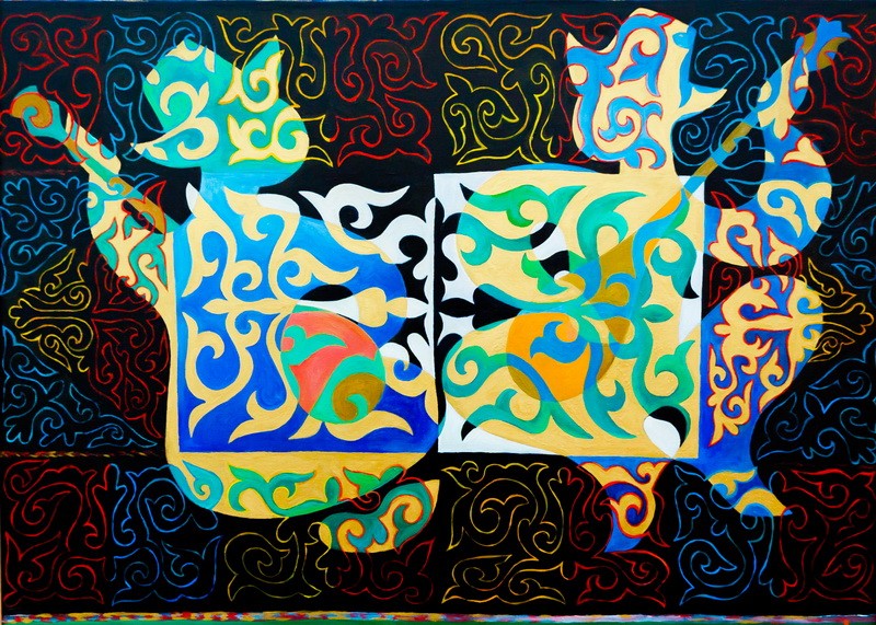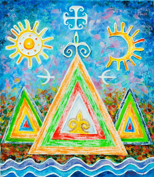 - В последние годы я увлеклась философией тенгрианства, это настолько любопытно, что все больше и больше меня захватывает, - продолжает она. - Тенгрианство призывает жить в гармонии с природой, окружающим миром, самим собой, в нем проповедуется сакрализация всего сущего - все вокруг священно. Многие заповеди тенгрианства, зародившегося в V-I веках до нашей эры, легли в основу мировых религий. Кто-то сказал, что тенгрианство - это звездный плащ, наброшенный на плечи всех религий. До сих пор в традициях и обычаях тюркских народов сохранились отголоски тенгрианского мировоззрения, у казахов даже есть выражение “Тəңір берді” и имя Танирберген. Все эти квадраты, круги, треугольники, которые вы видите в моей экспозиции, - это все тенгрианские знаки. Круг и равносторонний крест - это солярные знаки, символы Солнца, а Солнце, в свою очередь, - символ Тенгри, верховного бога неба. Треугольник - женское начало, это символ Умай, богини Земли, плодородия, ее также символизировало изображение Луны. Квадрат - знак Земли - четыре стороны света, Вселенная. И еще, что интересно, наши предки воспринимали окружающий мир и себя через цвет... Много интересных вещей открывается, когда копаешься, изучая культуру далеких предков, и меня это настолько увлекло, что я уже не могу оторваться.