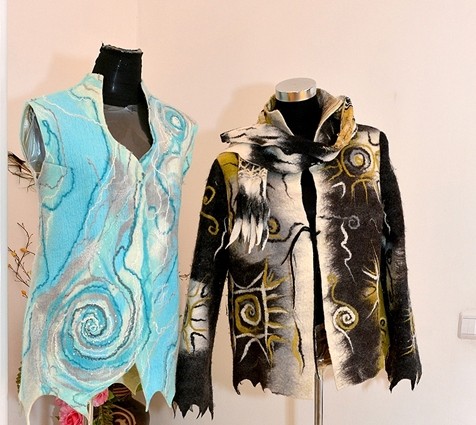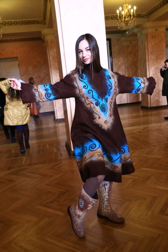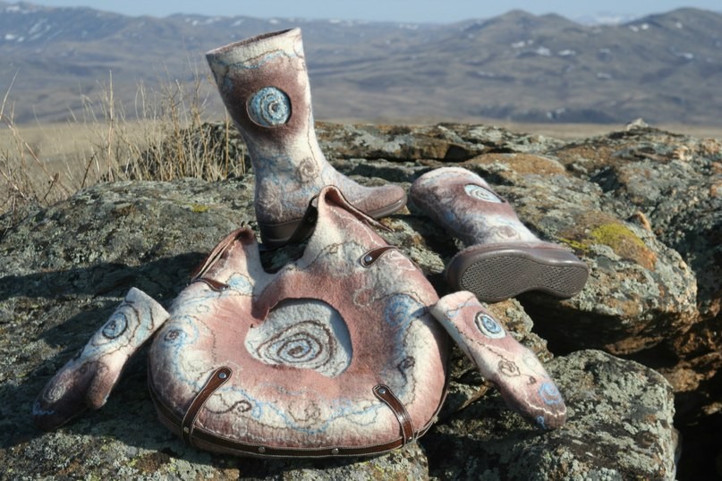 Начинала мастерица с крошечных пинеток, а теперь валяет из войлока платья и пальто. Сейчас в ее коллекции более 300 эксклюзивных работ. Дважды становилась финалисткой республиканского конкурса «Шебер» в Алматы.