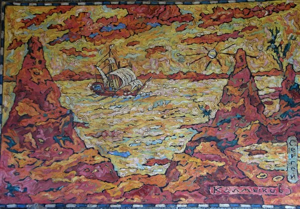 Малоизвестный и непризнанный при жизни, Калмыков в настоящее время считается одним из лучших представителей русского авангардного искусства, автором более полутора тысяч картин, рисунков, иллюстраций, театральных декораций и литературных текстов. Его учителем был знаменитый художник Кузьма ПЕТРОВ-ВОДКИН, автор картины “Купание красного коня”. А прототипом изображенного на холсте юноши являлся сам Сергей Калмыков. Впрочем, кроме произведений искусства он оставил после себя и богатое литературное наследие.