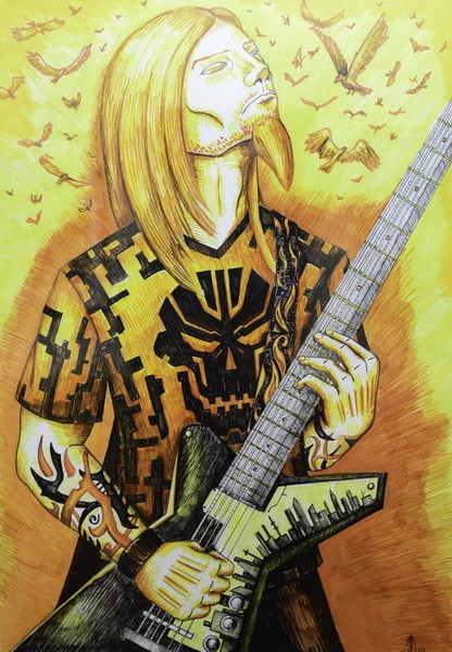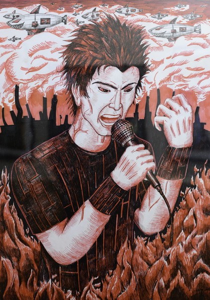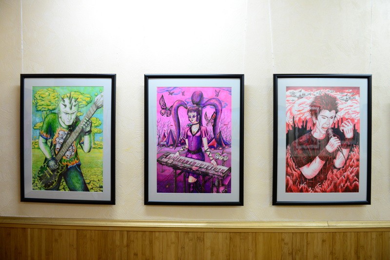 По словам автора, у каждой работы своя история, свой запал, свое настроение. К примеру, картина “Вокалист” - это сжигающее красно-оранжевое пламя творчества, ядовито-зеленый “Басист” - могучий дух творчества, олицетворение сложного, трагического пути настоящего музыканта, а черно-белый “Барабанщик” - знак бесконечности космоса и музыки.
