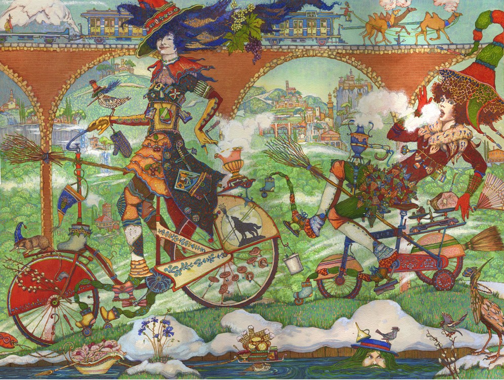- У Петра есть работа “Тосканские ведьмы. Весна”, - рассказывает Наташа. - Он ее написал в Италии. Потом мы переехали во Флоренцию и как-то сидим в кафе, и мимо нас проезжают две девушки на велосипедах: одна с огромной рыжей шевелюрой на маленьком велике, а другая на большом. Мы смотрим на них и не верим своим глазам - дамы как-будто сошли с картины.