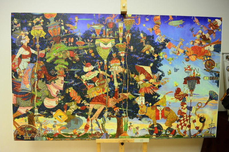Про Фролова говорят, что он волшебник, умеющий превращать ноты в людей и оживлять вещи. В его полотнах настолько много деталей, что можно часами их разглядывать. Чего только стоит картина “И я там был”, написанная по мотивам сказок Александра Сергеевича Пушкина. В размере 1,5х1,9 метра он сумел разместить сказочное государство, в котором живут Царевна Лебедь, ткачиха с поварихой, со сватьей бабой Бабарихой, Гвидон, царь Салтан и другие персонажи.