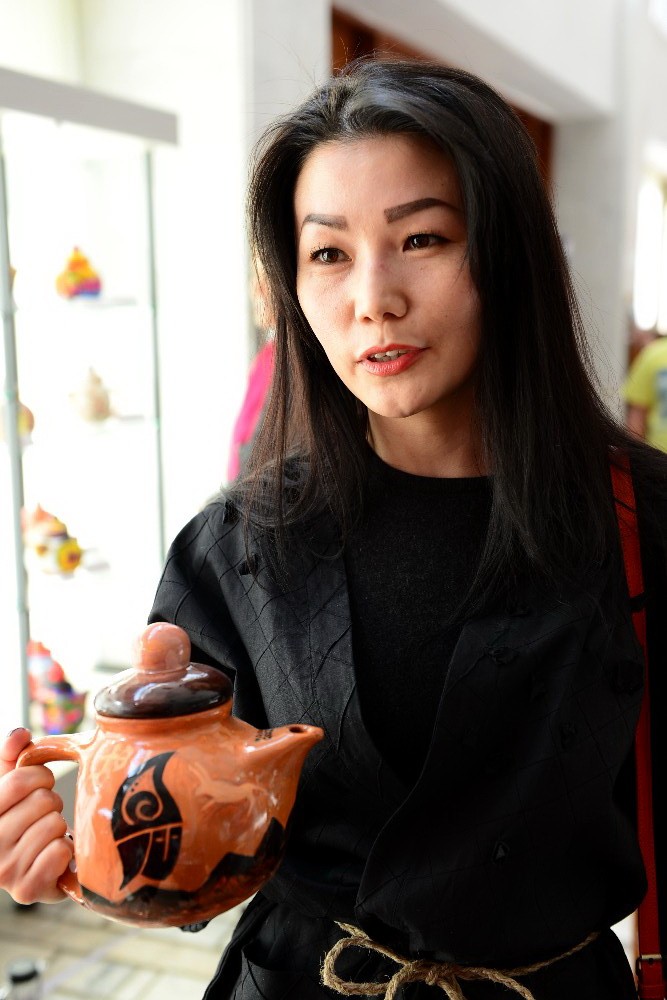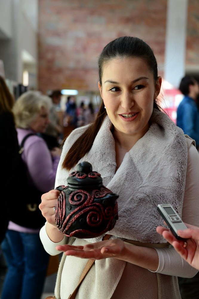 - Когда я увидела белый чайник, мне захотелось добавить немного объема, потому что просто разрисовывать было неинтересно, - признается дизайнер Дария АКПАРОВА (на снимке). - Я украсила его орнаментом из глины, и получился настоящий восточный чайник. Люблю пить чай из таких заварников, потому что в них он получается настоящим и вкусным.
