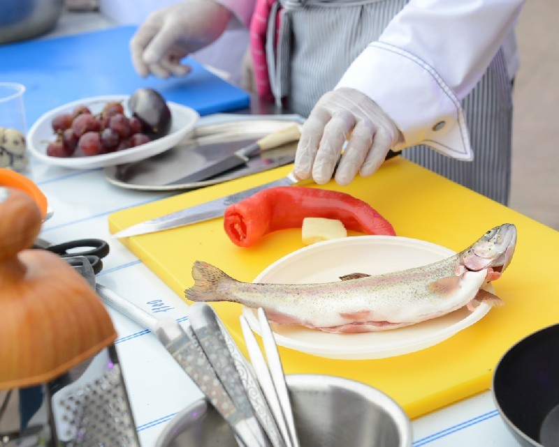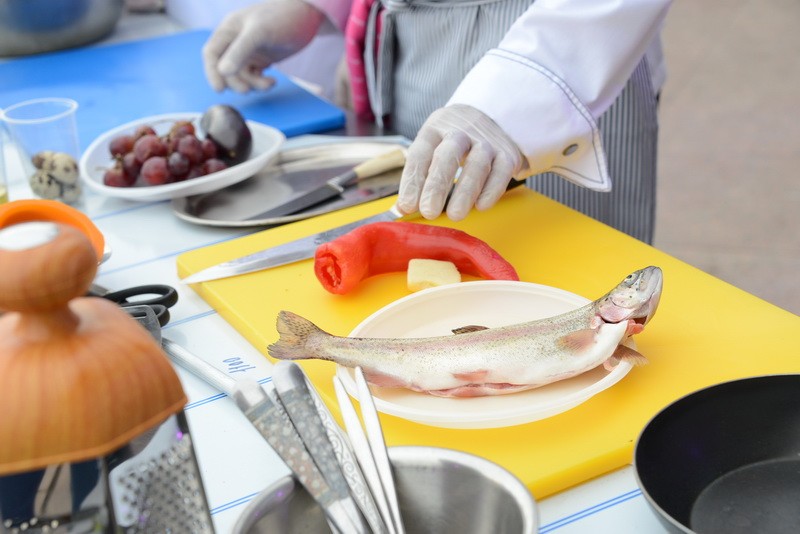 Конкурсанты выходили по семь человек. Затем им выносили черные ящики, и они начинали творить. Причем состав продуктов для каждой партии участников был разный: говядина и куриное филе, креветки и форель, авокадо и виноград, бананы и баклажаны.