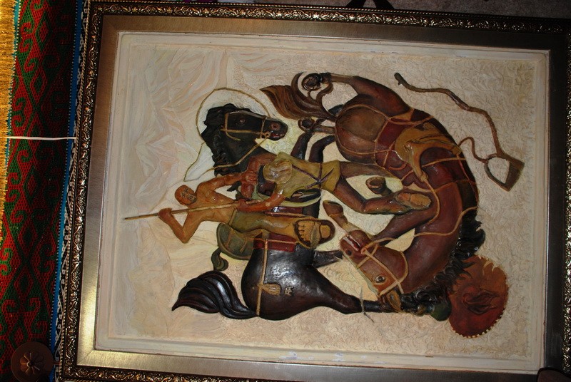 - Сегодня впервые выставил картину “Единоборство” из кожи, - рассказывает Алтынбек АБДУЛДАЕВ. - Сделана она в технике тиснения. Над ней я работал несколько месяцев и, конечно, немного переживаю, как воспримет ее зритель. Это достаточно сложная и кропотливая техника. На первый взгляд кажется, что каждый фрагмент картины сделан отдельно и приклеен, но на самом деле это один кусок кожи и вся композиция едина. Как так получилось? Секрет мастерства.