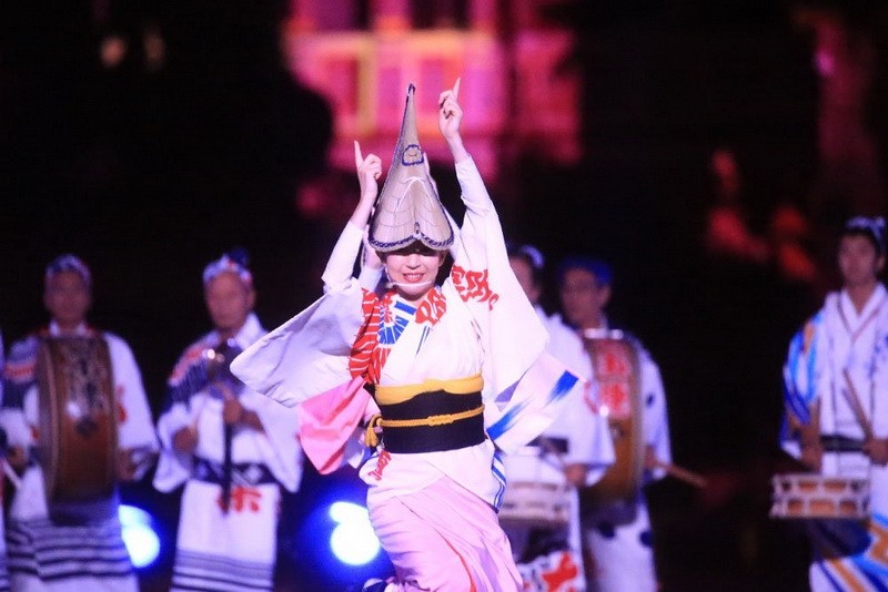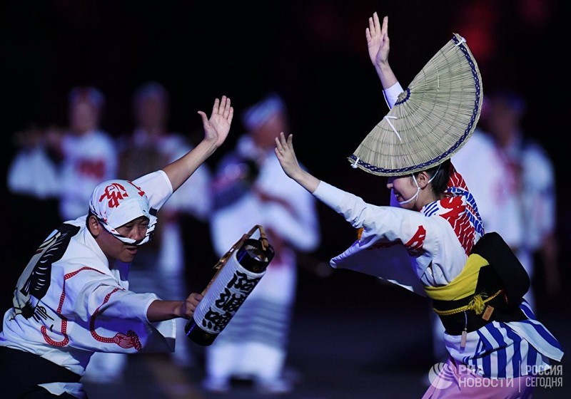 Когда на площадь вышли японцы, зрители замерли, потому что девушки были обуты в деревянные гэта, а мужчины - в белые носки таби. Плясать на брусчатке в носках - серьезное испытание, но гости из Страны восходящего солнца выступили отлично, за что были вознаграждены долгими овациями.