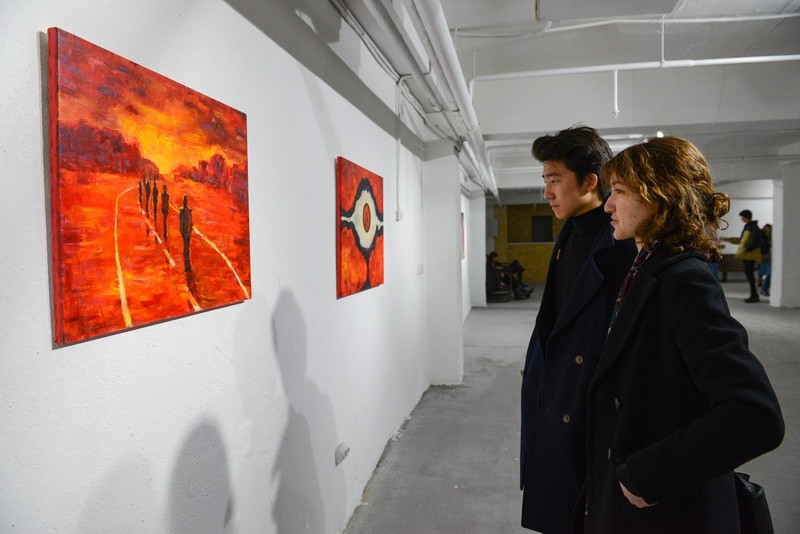 На суд зрителей автор представил 21 работу в разных жанрах. Гвоздем экспозиции стал портрет “Азиатка”, в котором представители фэшн-индустрии моментально узнали молодого дизайнера Дамели СУЛТАНБЕКОВУ. Она с радостью позировала фотографам, стоя у холста. Не меньший интерес вызвало полотно “Танец перед зеркалом”, выполненное при помощи болта, гвоздя и отрезка веревки.