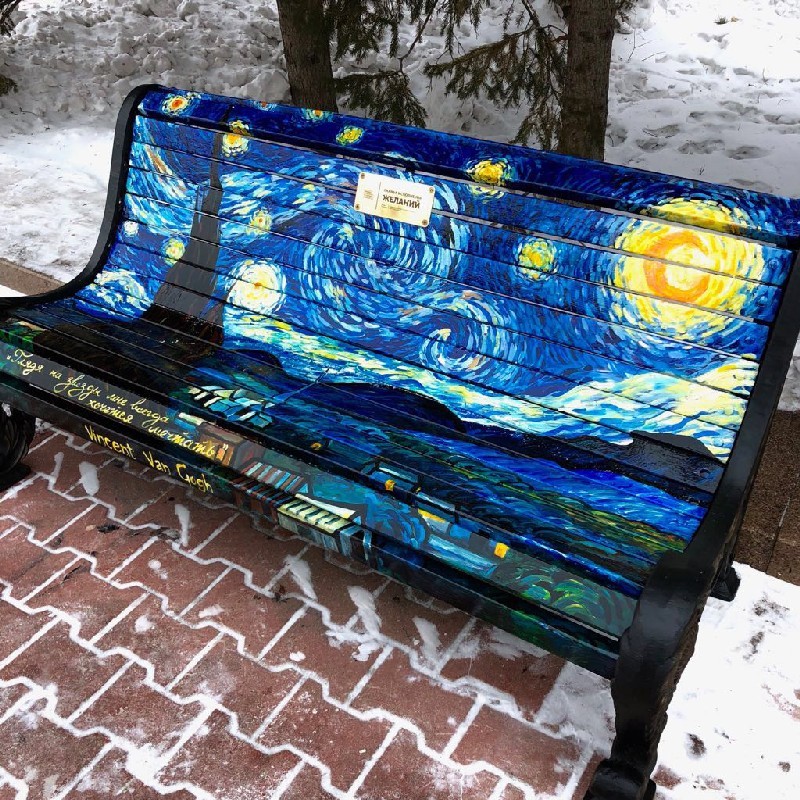 В Астане появилась скамейка исполнения желаний, расписанная под полотно Винсента ВАН ГОГА “Звездная ночь”.