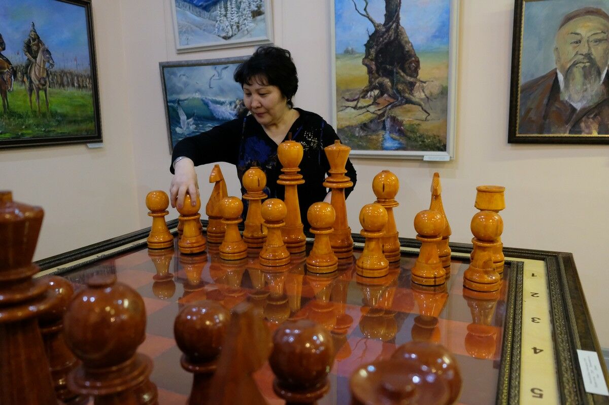 В Центральном выставочном зале представлены самые разные работы - от академических картин маслом до батика и гобелена, скульптур из дерева и даже искусно украшенных предметов быта: шахматы, традиционная колыбелька-бесик, шкатулки, настоящие музыкальные инструменты и композиция, в центре которой кобыз.
