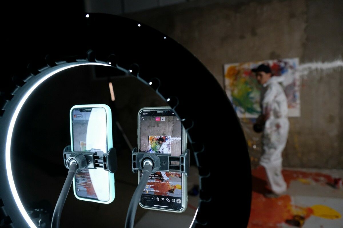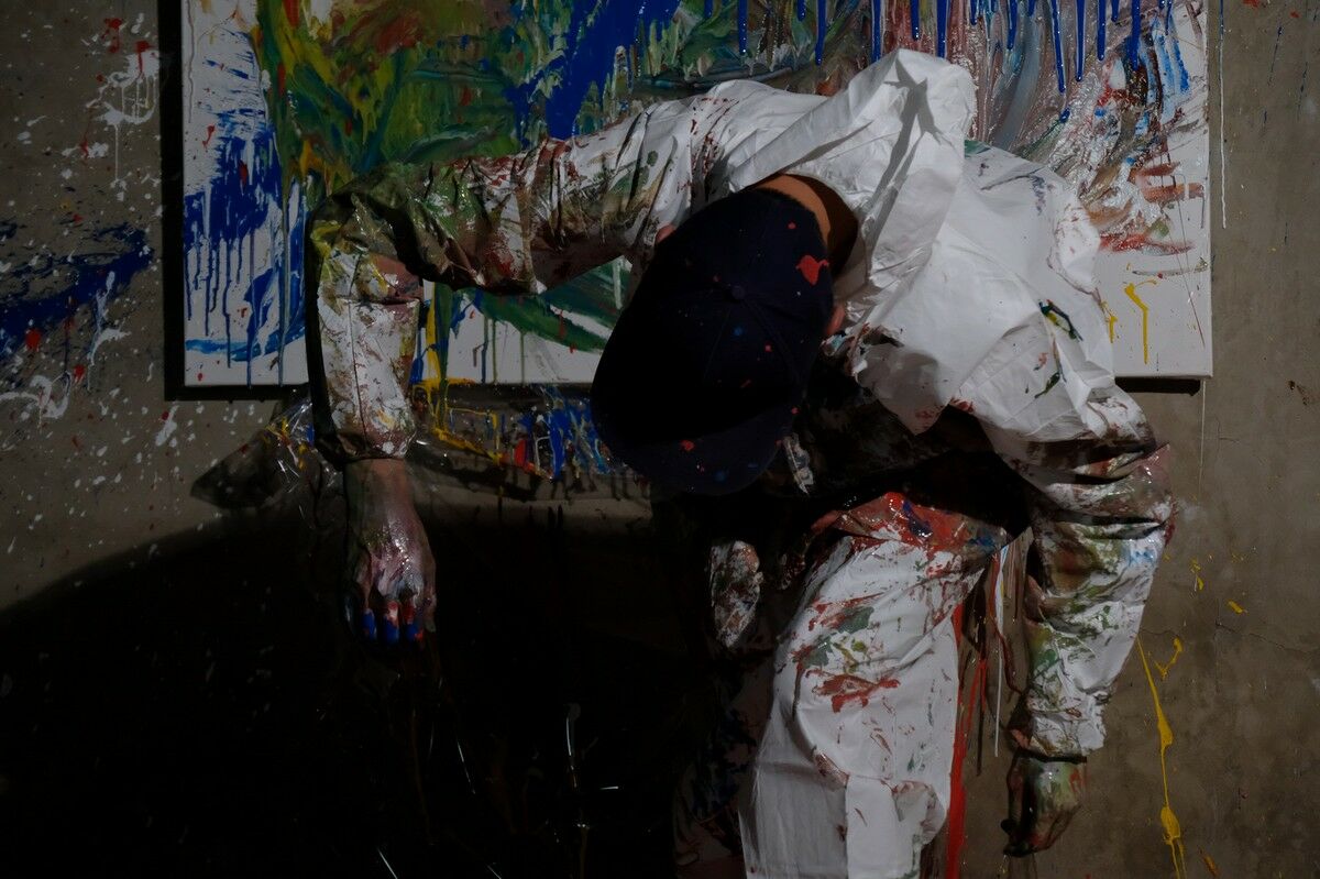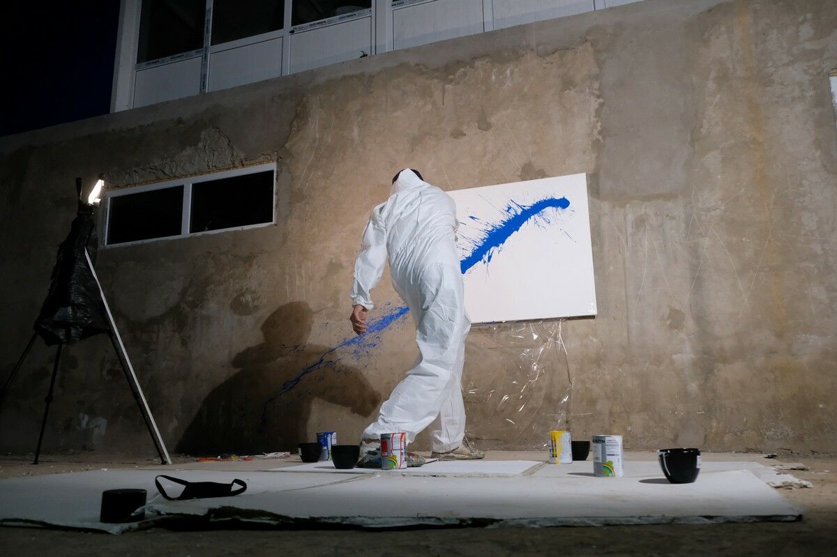Зрелище в заброшенном помещении на территории “Атакента” было впечатляющим: ровно в 20.20 включилась камера, транслирующая онлайн-перформанс, Марат торжественно снял маску (медицинскую) и под музыку начал свое действие. Какие-то краски он небрежно выплескивал на приготовленный холст, какие-то лишь разбрызгивал. Из каждой баночки сначала выливал небольшое количество на пол и, танцуя, размазывал это все. Сам холст щедро поправлял руками, ладонями и даже спиной.