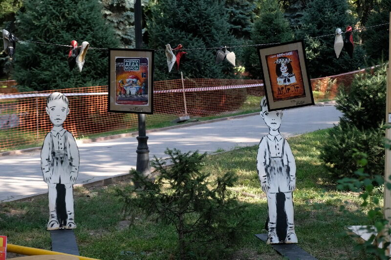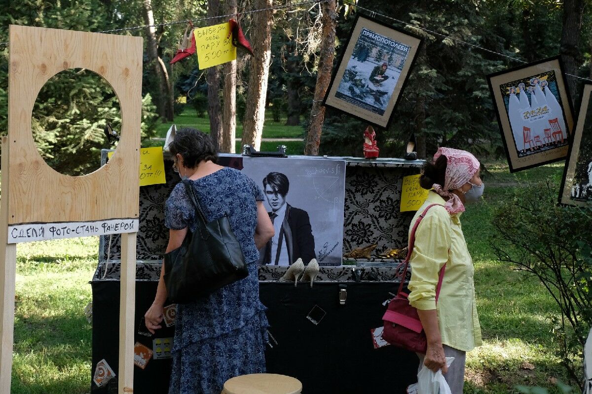 На траве всюду импровизированные лотки со шляпами, чемоданами, проездными билетами, деревянными масками... Артисты с гордостью сообщают, что это их протестное изобретение. Дескать, обидно же, когда под словом “маска” подразумевается только медицинский аксессуар, ведь изначально это всегда был символ театра. Вот такая маска на палочке защищает от вирусов и от полиции. Рядом скромно лежит муляж бомбы с цифровым механизмом - тоже полезная в хозяйстве вещь, правда, ажиотажным спросом бутафория не пользуется. Но наибольший интерес среди дам вызвал огромный сундук с обувью. Он “работал” в спектакле “Аккомпаниаторши” и вобрал в себя все двадцать лет истории - всю обувь, которая когда-то использовалась в спектаклях. Зато, порывшись в его недрах, вы подберете подходящую по ноге пару, и обойдется она вам всего в 500 тенге.