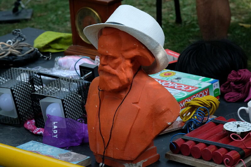 Бюст Карла Маркса - настоящий долгожитель в театре, он десять лет играл в спектакле Back in the USSR, причем его партнер Ленин, который каждый спектакль падал из рук пионеров и разбивался на мелкие кусочки, был, что называется, исходящим реквизитом. А Маркс оказался живее всех живых. В итоге его отмыли и продают как часть двадцатилетней истории театра.