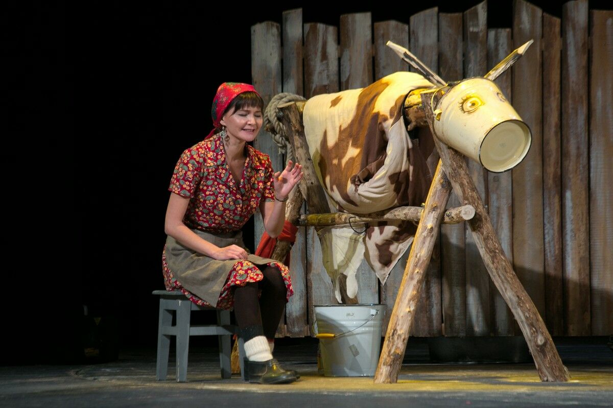 Но ради прикола на киносеанс селяне приходят… в медицинских масках. Видимо, это очень смешной намек на день сегодняшний. А в результате возникает ощущение чудовищных нестыковок. Кажется, что это мелочи, но когда их много, это колет глаз. Станиславский в этот вечер горло бы сорвал, вопя свое коронное “не верю”: от суетливости актеров, от неумения вообразить корову и погладить ее широким жестом, а не как домашнего бобика; от того, что, изображая русскую бабу, актриса то окает, то гэкает, словно никак не может определиться с диалектом. И таких “блох” огромное количество. Сами истории безумно обаятельны, но хочется попросить всех уйти со сцены и прочитать их в виде рассказов, а не смотреть в такой пародии на театр. Хотя изрядно истосковавшийся по театру зритель все-таки поаплодировал участникам действия.