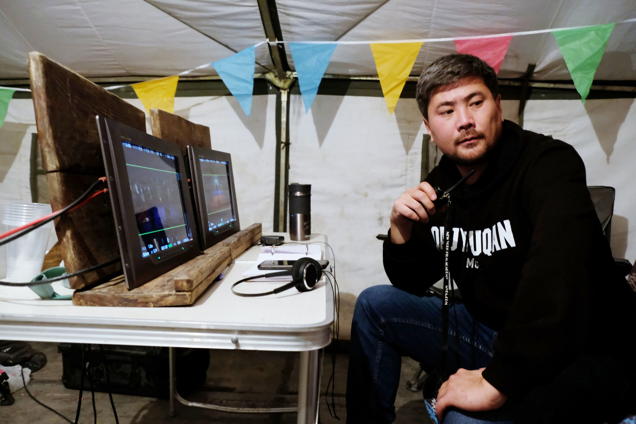 Оживает громкоговоритель: “Внимание, приготовиться! Массовка - убираем телефоны”. Срочно покидают площадку гримеры, до последнего проверявшие публику на наличие современных сережек, предметов одежды, подстригавшие усы, поправлявшие шляпки. И по команде рефери из полутемного угла появляется огромная фигура Кажимукана. “Массовка, болеем, болеем! Нет, не подзадоривай противника, не надо, ты же добряк”. Команды Канагат отдает из своего кабинета-палатки. Вместо раскладного стула обшарпанный, чуть ли не дачный полудиванчик, мониторы расположены на каких-то жутких самодельных деревянных подставках, рядом на стуле грудой навалены медали и награды главного героя. Это святая святых, куда приходят по вызову рации.