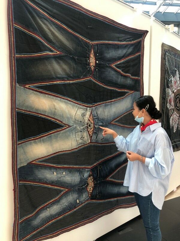 В конце экспозиции посетителей ждут восточные ковры и гобелены Алексея ШИНДИНА из поношенных джинсов, выцветших шапок, отрезов старых тканей и рабочих перчаток.