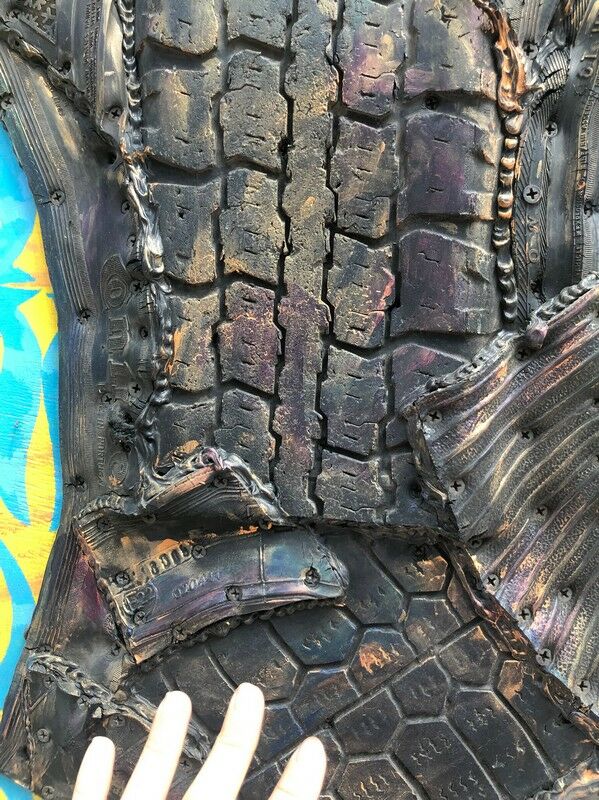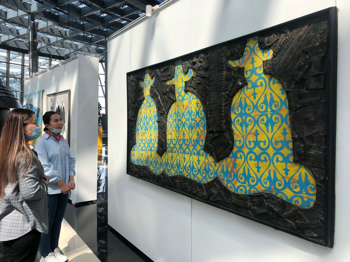 Экспозиция заставляет задуматься, сколько разных товаров мы потребляем ежедневно и отправляем на свалку. Одно из ключевых полотен на выставке - картина признанного мэтра современного казахстанского искусства Молдакула НАРЫМБЕТОВА “Три бия”, выполненная из отработанных шин.