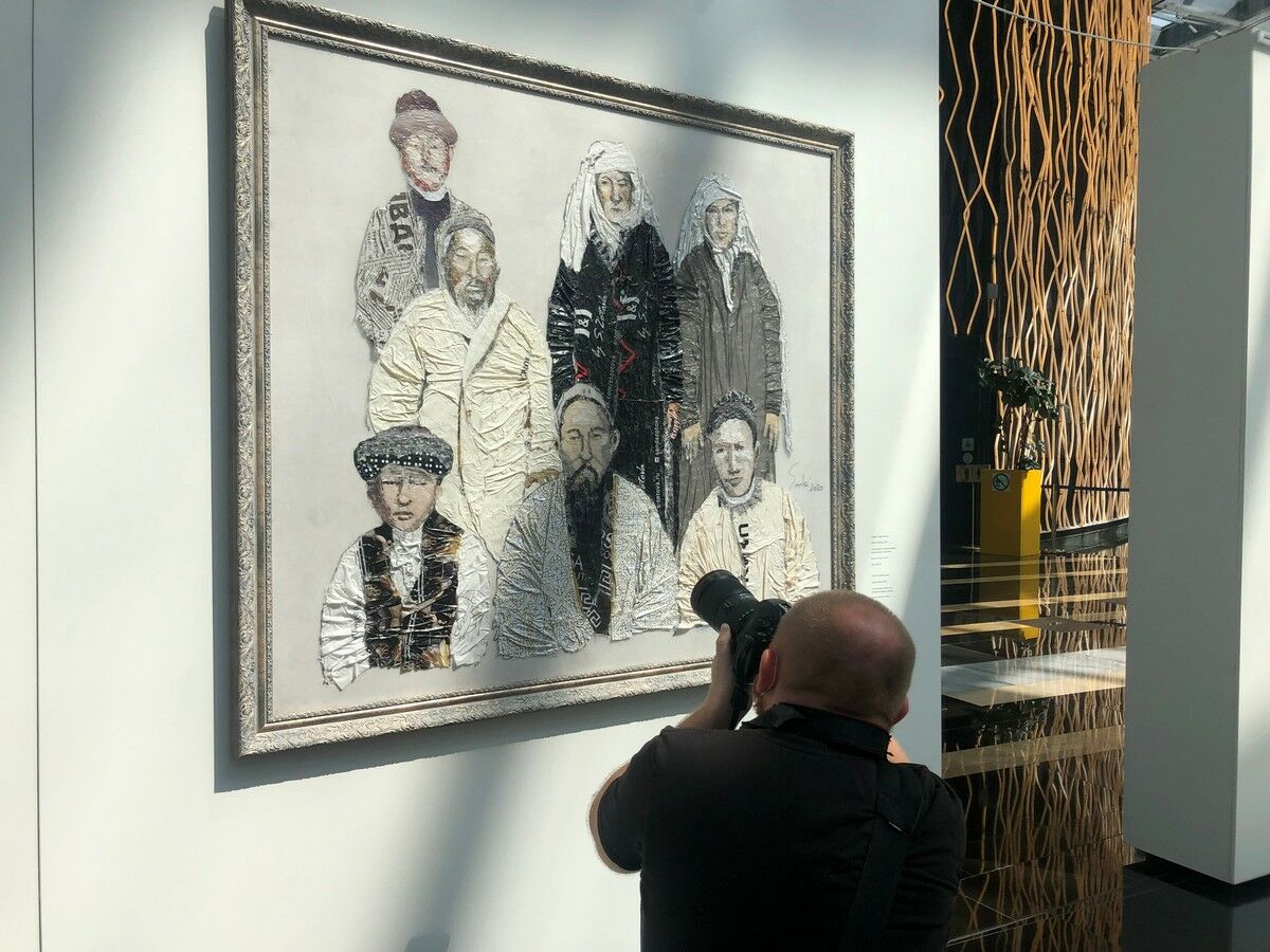 Полотна Losing Identity и “Семья Абая” Сауле СУЛЕЙМЕНОВОЙ издалека кажутся вполне традиционными, выполненными маслом или акрилом. А на деле вместо красок полиэтиленовые пакеты. Ими же задрапированы не только вещи, но и морщины, вырисованы брови, глаза и все мелкие детали. На каждую картину ушло по нескольку тысяч пакетов.