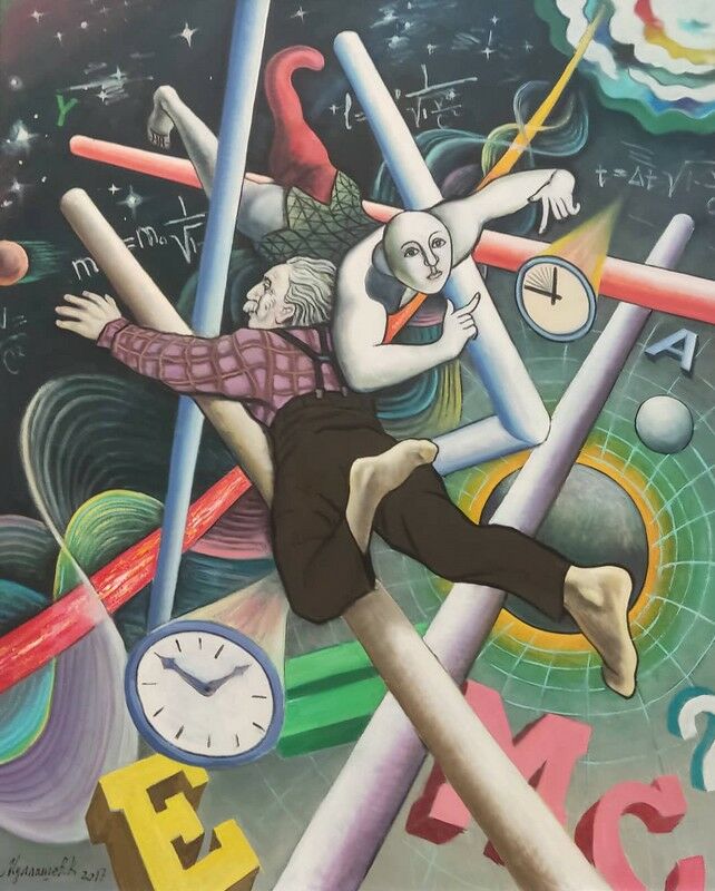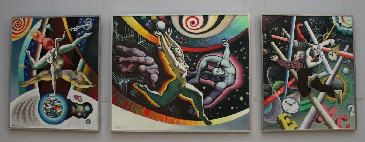 Но на этой выставке есть другой триптих 2017 года. Он уже про внезапно наступившее будущее, про виртуальный мир, с Альбертом Эйнштейном, несущим человека на плече через космос.