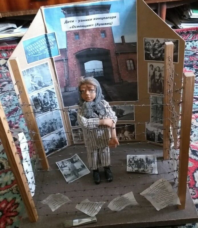 Куклу мастерица делала долго и тщательно, о чем и рассказала школьникам, передавая свою работу музею. Лидия подробно описала все этапы: как создавала проволочный каркас, изготавливала ручки и ножки из пластика, запекала детали в печи. Как шила крохотную одежду, состаренную для достоверности. Вокруг фигурки создано целое пространство с документальными фото детей и миниатюрной колючей проволокой. Такая тщательность в деталях дает ощущение достоверности.