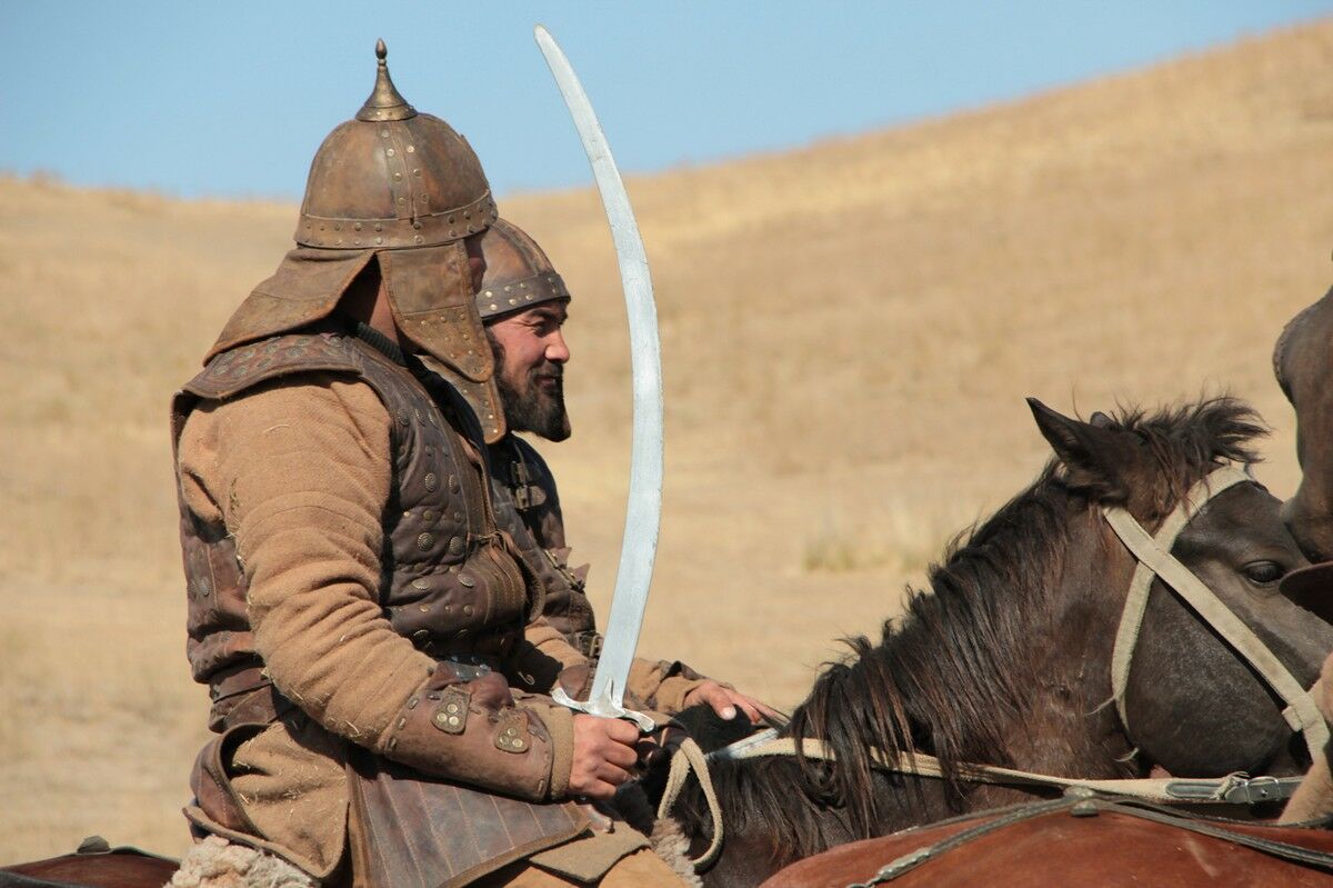 По замыслу режиссера, фильм начнется со сцены, когда батыры с мечами на лошадях должны разнести закрепившихся в степи кокандцев. У врагов закрыт черной тканью низ лица, а глаза подведены темным, чтобы выглядеть страшнее. Каскадеры на лошадях, впрочем, тоже имеют вполне устрашающий вид. Костюмы выполнены максимально достоверно: кожаные шлемы снабжены войлочными подшлемниками, легкая защита, и только оружие исключительно бутафорское.
