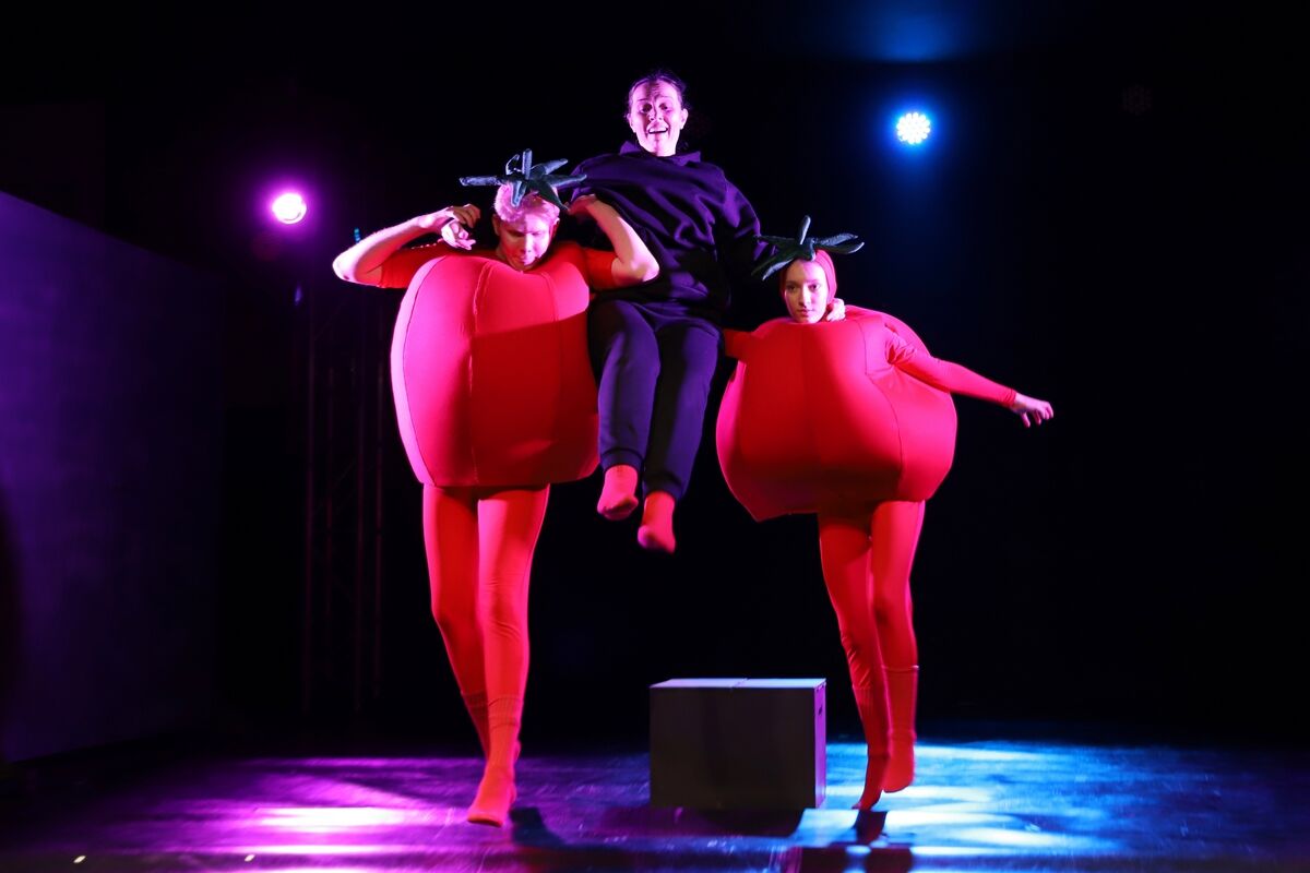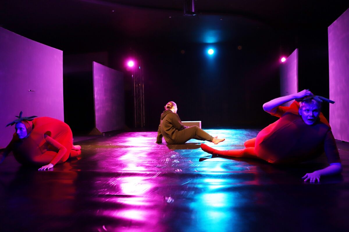 Так и здесь: на сцене, погруженной во мрак, где артисты двигаются и говорят как кодами в матрице, этакий цифровой дождь, вдруг появляются… танцующие помидоры. И это тоже про нашу реальность, когда любую боль маскируют сетевой.