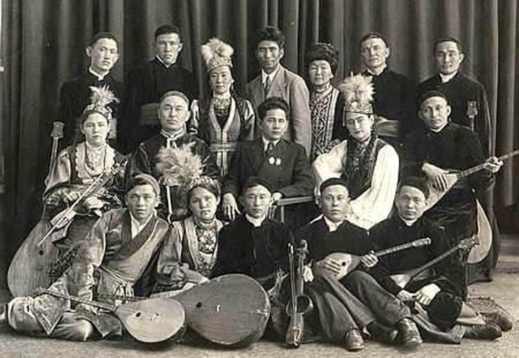 - Вот посмотрите на фотографию оркестра Курмангазы 1943 года. На ней сам маэстро Жубанов, его знаменитый ученик, дирижер и композитор Нургиса ТЛЕНДИЕВ, певица Айсулу БАЙКАДАМОВА, тенор Куан ЛЕКЕРОВ, которые исполняли главные партии в театре имени Абая. И обратите внимание на инструменты. Сейчас вообще нет таких! - восклицает наш собеседник.