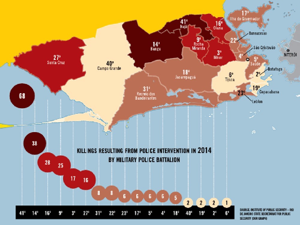 В 2011 году число жертв произвола полицейских стало уменьшаться, однако в период с 2013 по 2014 год снова выросло на 39,4% в штате и на 9% в административном центре. “Количество полицейских убийств представляет собой значительный процент от общего количества убийств: 15,6% в 2014 году в городе Рио-де-Жанейро”, - сообщают правозащитники.