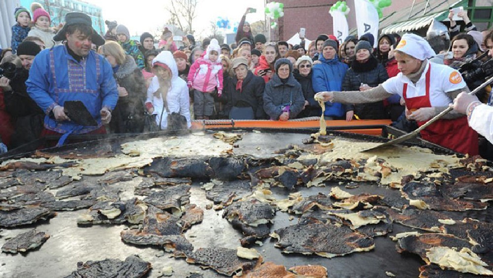 В последний день Масленицы на массовых гуляньях в московском саду “Эрмитаж” хлебопекам не удалось испечь рекордный блин-гигант: он не сразу отстал от дна сковороды, пригорел и порвался в нескольких местах.