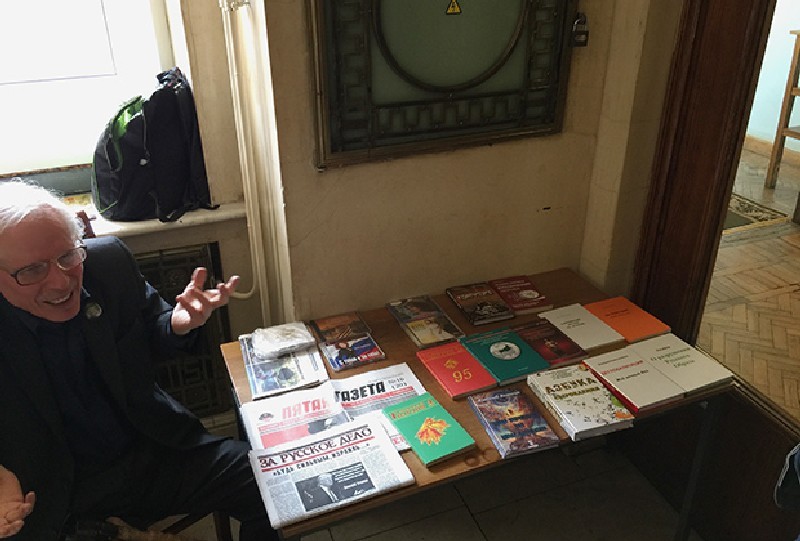В фойе развернули прилавки с литературой. Помимо газет “Русский вестник” и “Союз офицеров” на столах лежали книги с заголовками “Школа сыроедения”, “Деглобализация: мой вечный бой”, “О разрушении русского образа”, “Школа возрождения или школа вырождения”.
