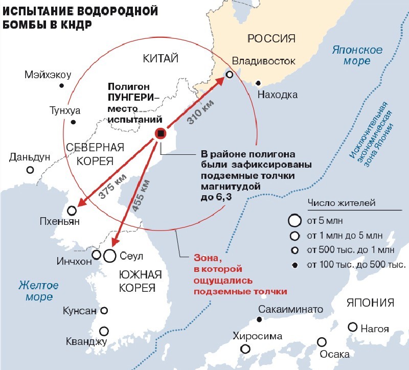 Проведенное ядерное испытание (по словам представителей Пхеньяна, водородное) стало уже шестым и самым мощным в истории КНДР. Генштаб Южной Кореи оценил мощность взрыва в 100 килотонн, японские власти - в 70 килотонн. По разным данным, взрыв вызвал землетрясение силой от 5,7 до 6,3 балла по шкале Рихтера (предыдущие тесты вызывали максимум 5,3 балла). Если оценки подтвердятся, происшедшее будет свидетельствовать о качественном росте возможностей Пхеньяна. Напомним, что сброшенная на Нагасаки в 1945 году американская бомба “Толстяк” имела заряд в 21 килотонну и привела к гибели приблизительно 150 тыс. человек, из которых около 80 тыс. умерли на месте. Максимальная мощность предшествующих испытаний в КНДР оценивалась приблизительно в 30 килотонн.
