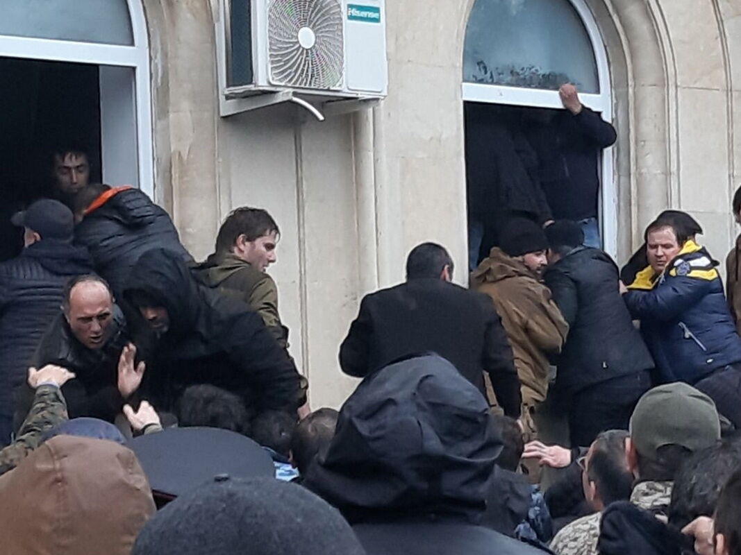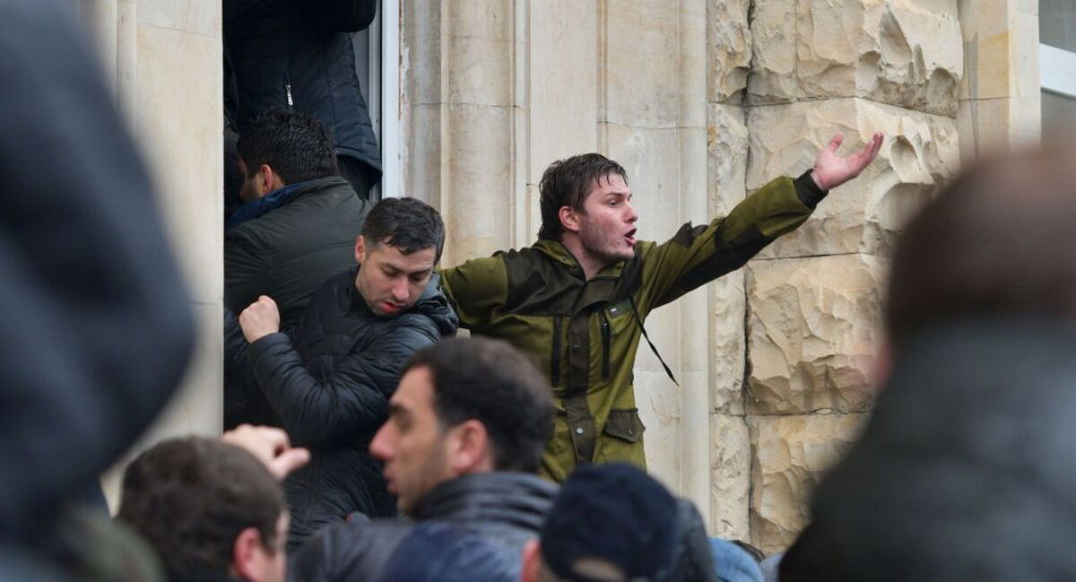 Утром 9 января в Абхазии протестующие вошли в здание администрации президента, прорвавшись сквозь оцепление силовиков. Они выбили несколько окон, в итоге силовикам пришлось закрыть их шкафами и тумбочками.