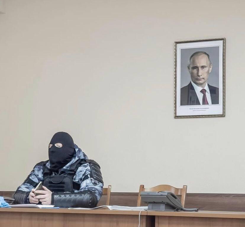 Снимок российского фотографа Дмитрия МАРКОВА с силовиком, сидящим под портретом президента РФ Владимира ПУТИНА в ОВД, продали на аукционе за 2 млн рублей ($26,8 тыс.).